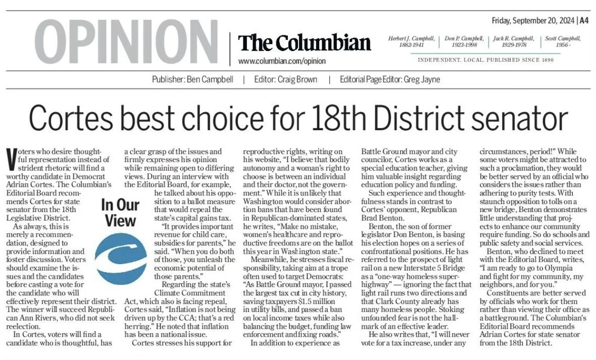 Our campaign is endorsed by The Columbian! Help power our campaign to victory today.